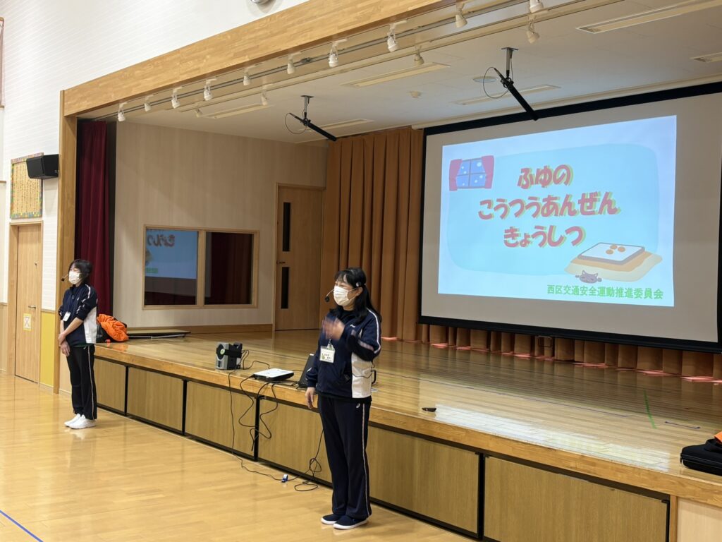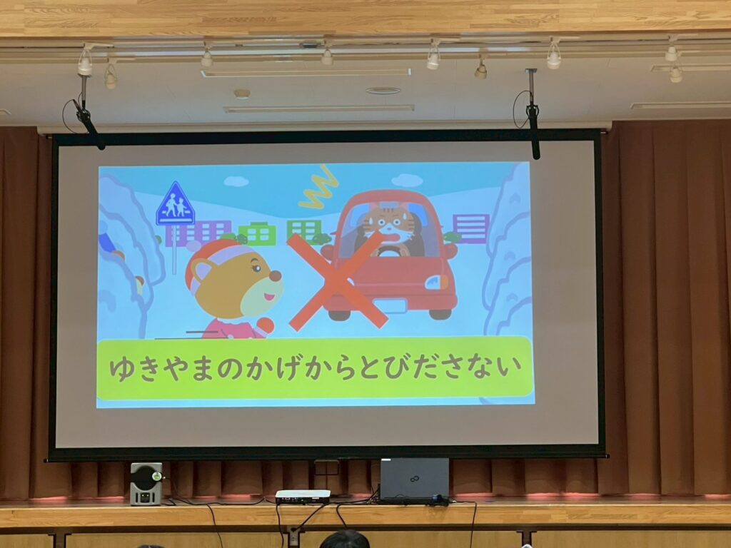 夏に引き続き、本日も西区の交通安全運動推進委員会から指導員の方にご来園いただき、冬の交通安全について、大切なことを教えていただきました。