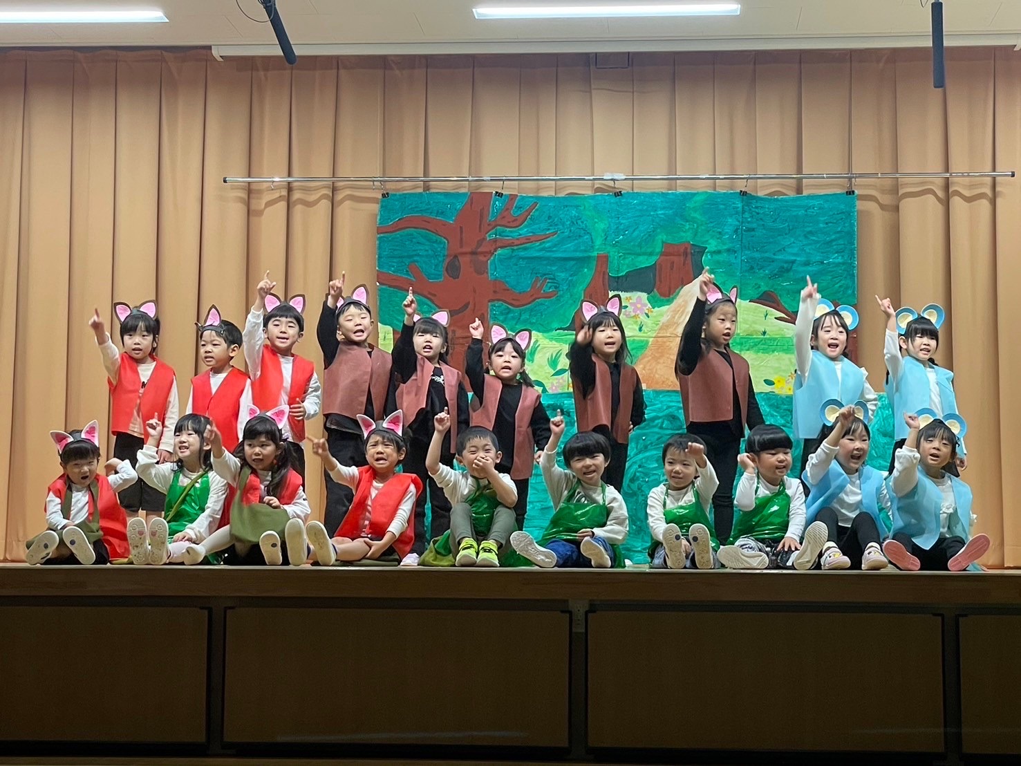年中 発表会に向けて 2024/10/30 昨日に引き続き、年中の皆さんもステージの上で表現を楽しみました!どのクラスも舞踊劇に取り組んでいますので、踊ったり、歌ったり、いきいきとした姿が可愛らしく、見ていると心が温かくなります。 あじさい 「ふしぎなキャンディーやさん」(絵本より) すずらん 「3びきのやぎとトロル」(ノルウェー民話より) さくら 「どうぞのいす」(絵本より) こすもす 「てぶくろ」(ウクライナ民話より) 今年は物語をみんなでつくっています。大好きになったお話を楽しんでいる年中の皆さんの表現をお楽しみに!