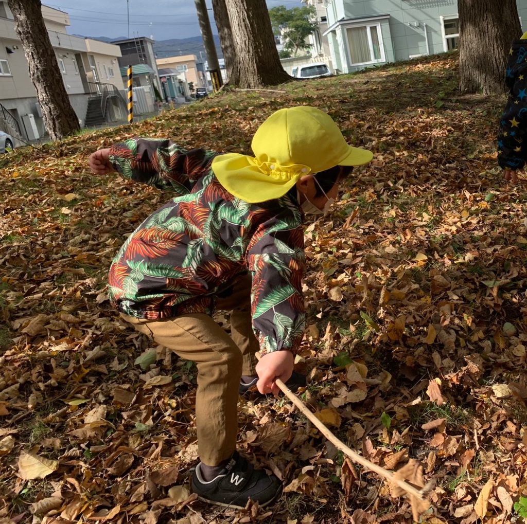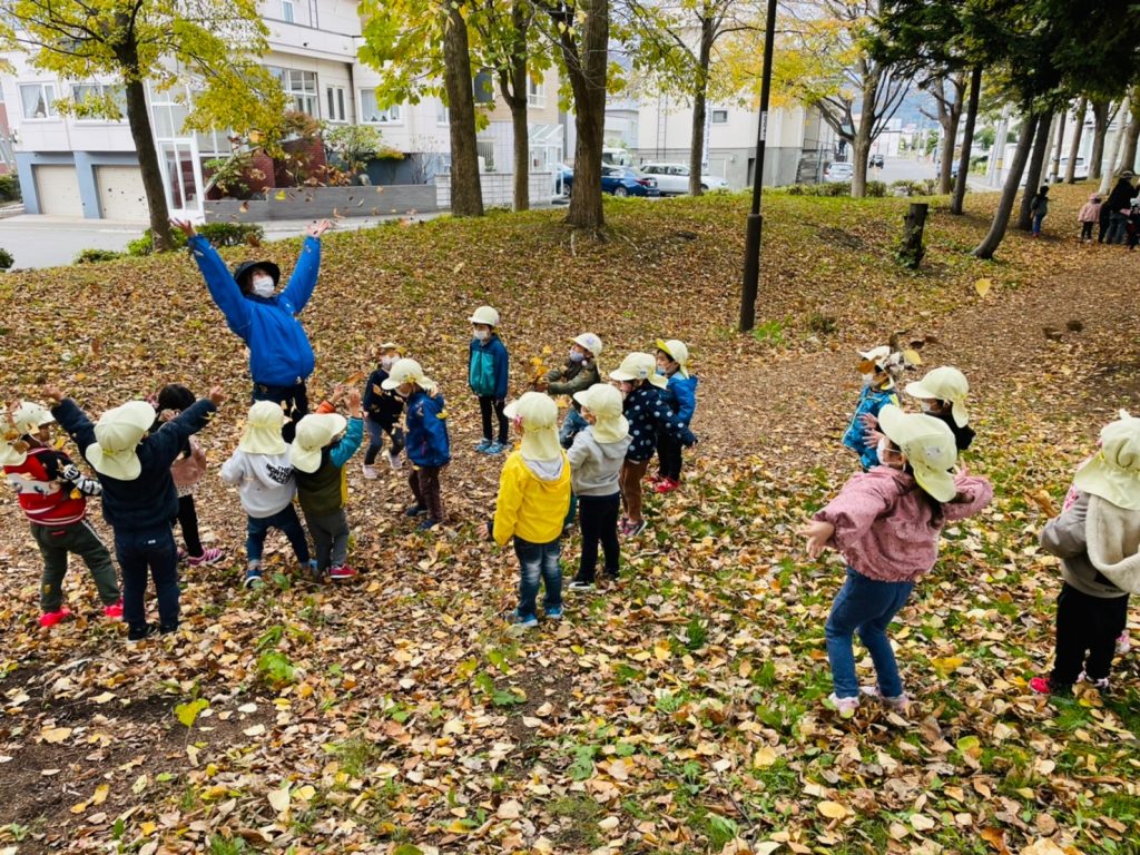 年少 落ち葉拾い🍂 2021/10/18 今日は、園の近くにある西陵公園に落ち葉を拾いに行ってきました!落ち葉の上を歩くと、「何だか音がする!」「赤い葉っぱ見つけた!」と子ども達から、たくさんの発見の声が聞こえてきました♪ 落ち葉を手のひらいっぱいに集め、『落ち葉シャワー』を楽しみました🍂 最後は、袋いっぱいに落ち葉を集めると、「これで焼き芋できるね!」と嬉しそうに教えてくれました。美味しい焼き芋ができますように!
