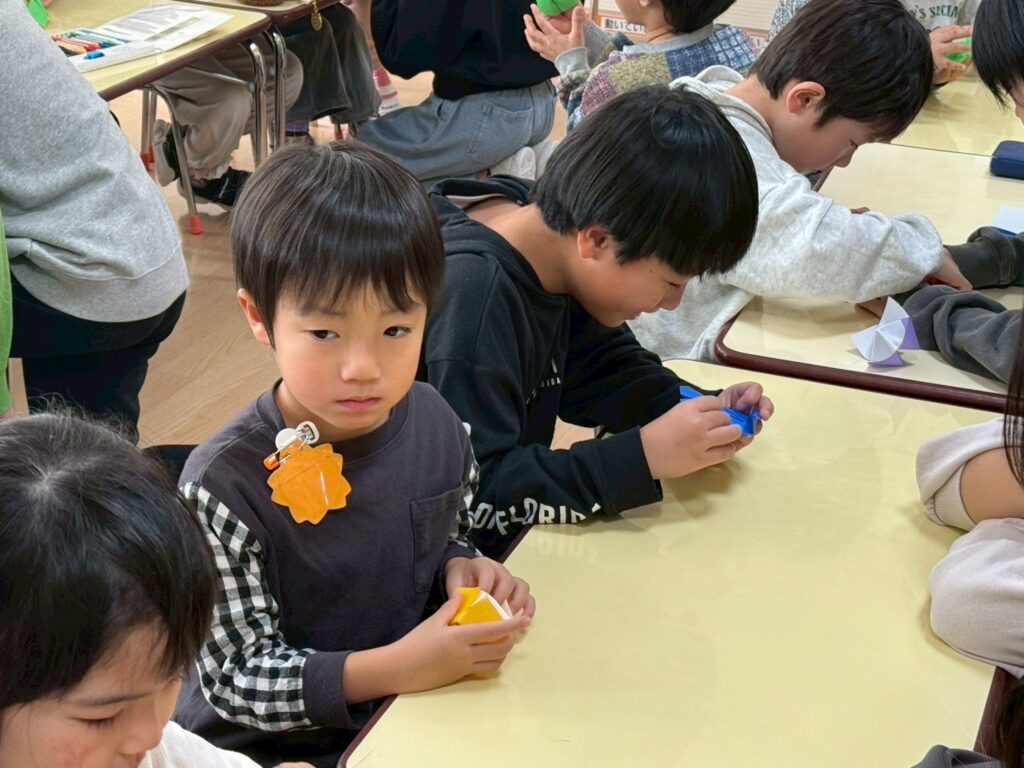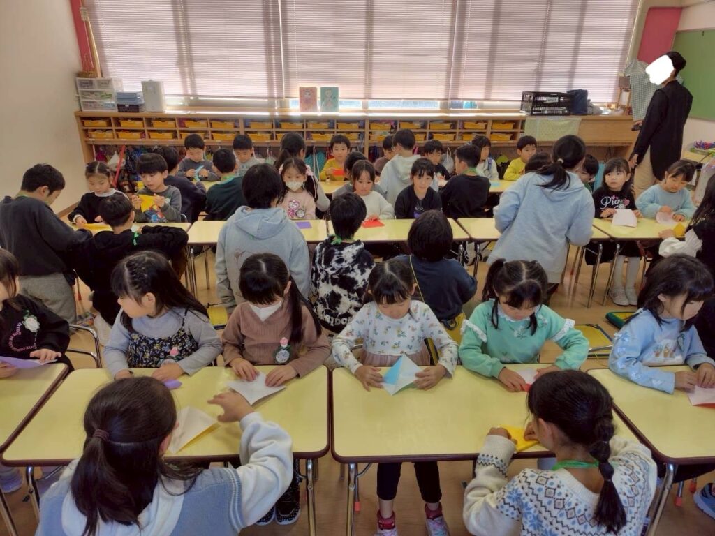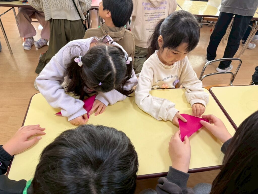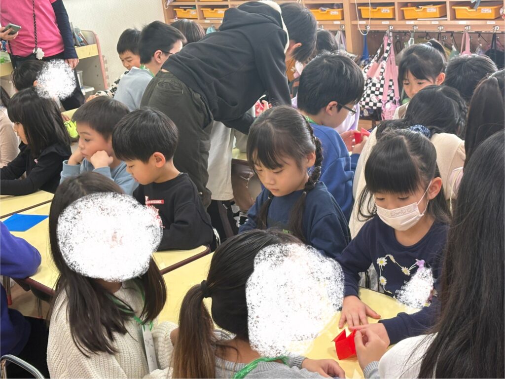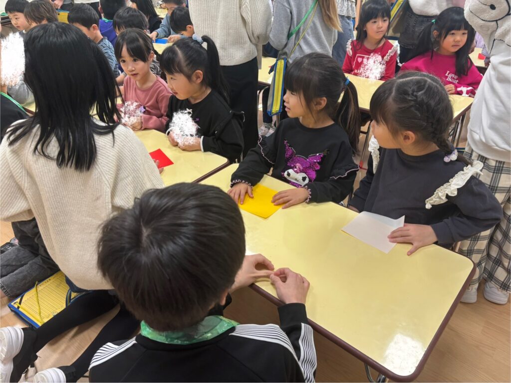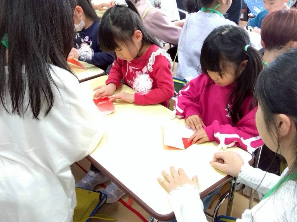 好きな色の折り紙を選んで、サンタさんの折り方を教えてもらいました。その後は、新聞ジャンケンをしたり、小学校○×ゲームをして小学生のお兄さんお姉さんと仲良くなることが出来た様子でした♡