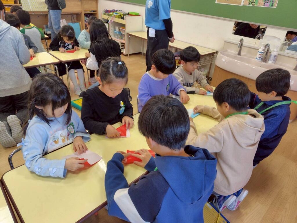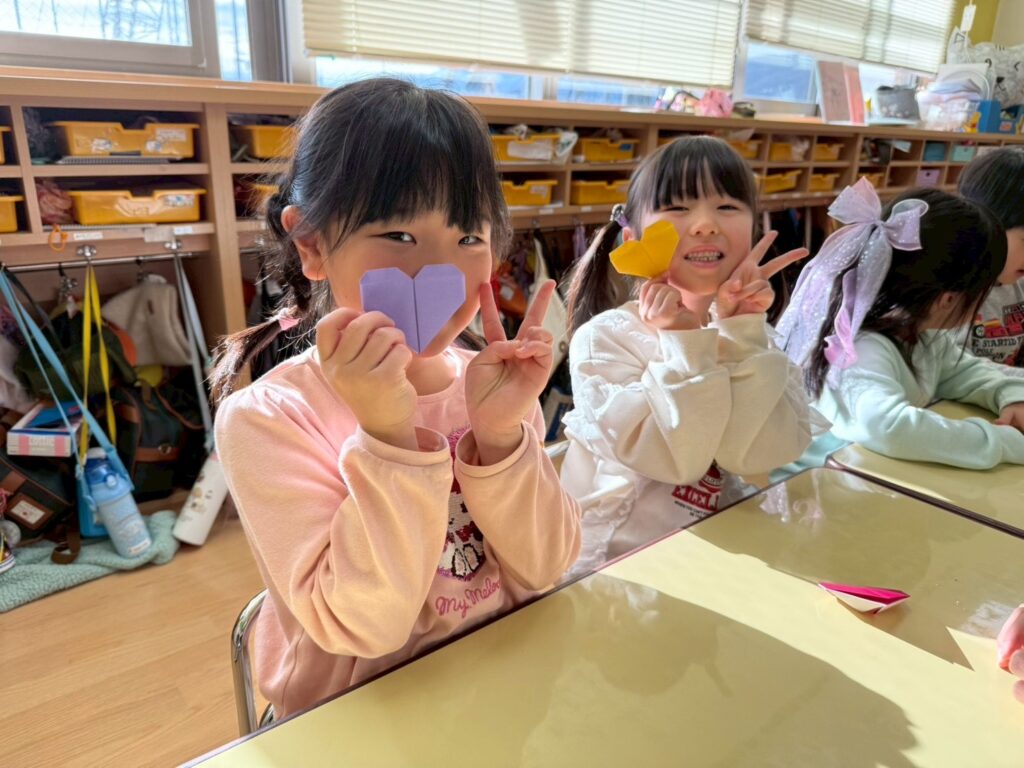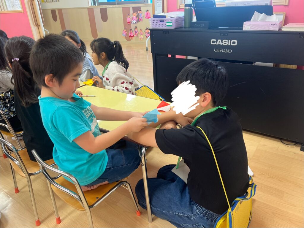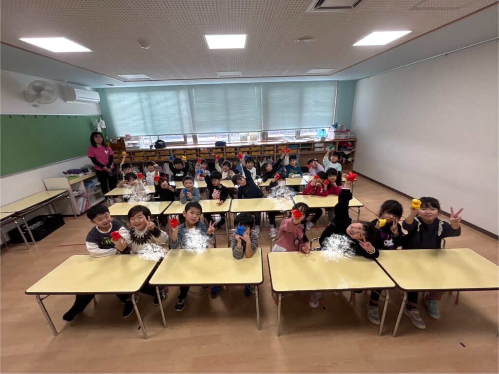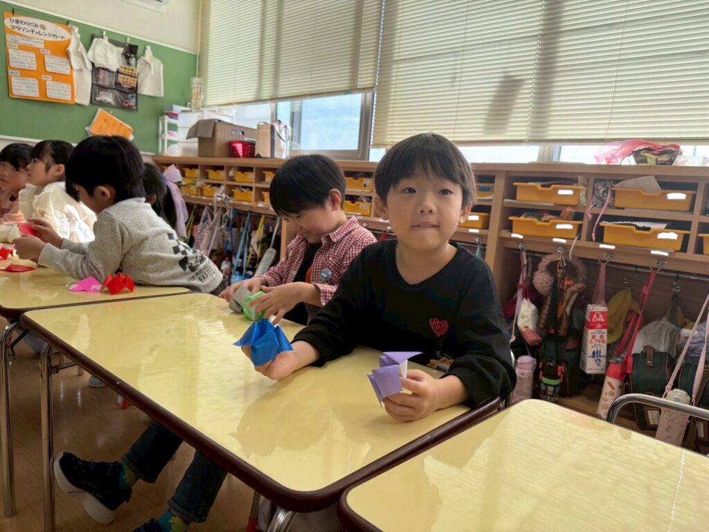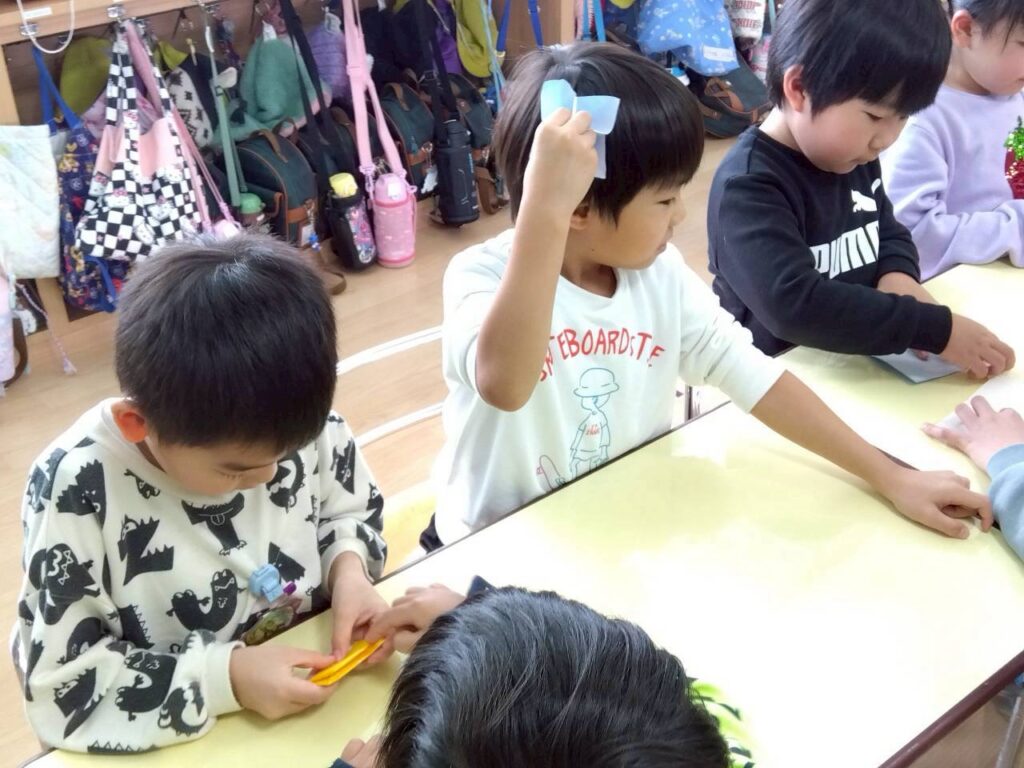 好きな色の折り紙を選んで、サンタさんの折り方を教えてもらいました。その後は、新聞ジャンケンをしたり、小学校○×ゲームをして小学生のお兄さんお姉さんと仲良くなることが出来た様子でした♡