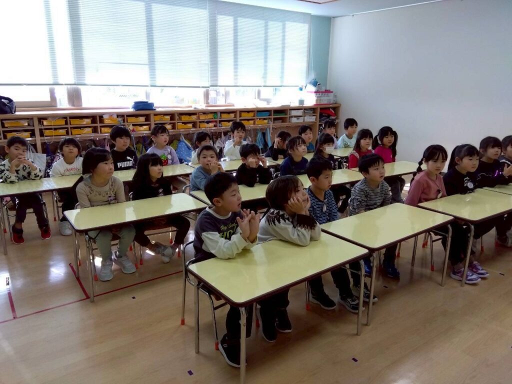 「何をしてくれるんだろう?」と期待いっぱいの子ども達。背筋をピンと伸ばし、5年生の皆さんがクラスに来てくれるのを心待ちにしていました♪