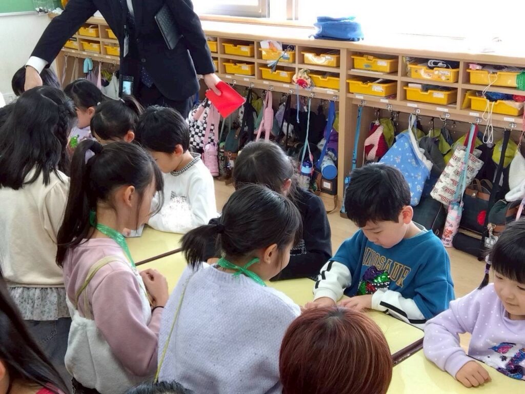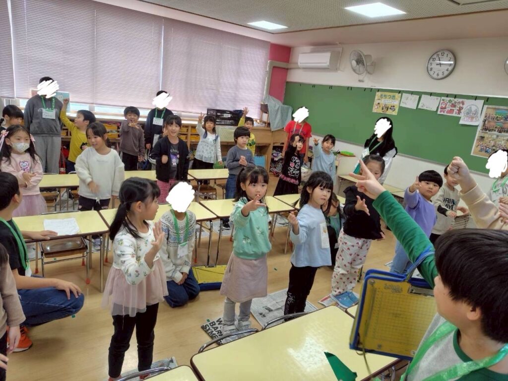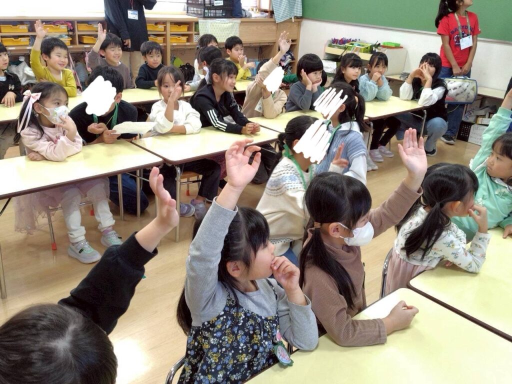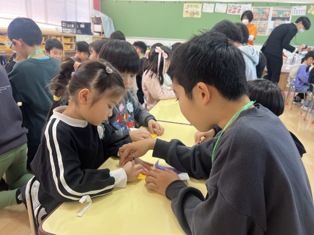 4色の中から好きな色を選んでパックンチョの作り方を教えてもいました。その後は、小学校の○×クイズをしたり、小学生に聞いてみたいことを質問して、有意義な時間を過ごすことが出来ました!